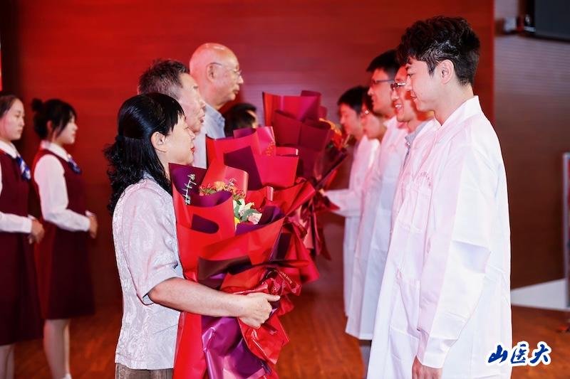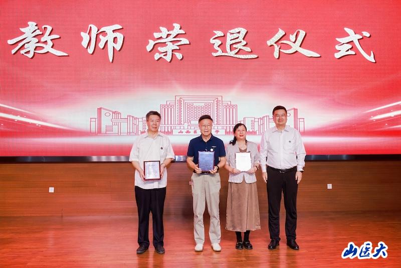 教师荣退仪式和师德传承仪式上,解军为荣退教师代表颁发证书,感谢一批批老教师、老同志多年来恪尽职守、甘为人梯,将最美的年华献给了党的教育事业和山医的发展。青年教师为老教师赠送鲜花,老教师为青年教师佩戴校徽,互赠祝福。师道承传,青蓝同心,山医事业在改革奋进中开启新的篇章。