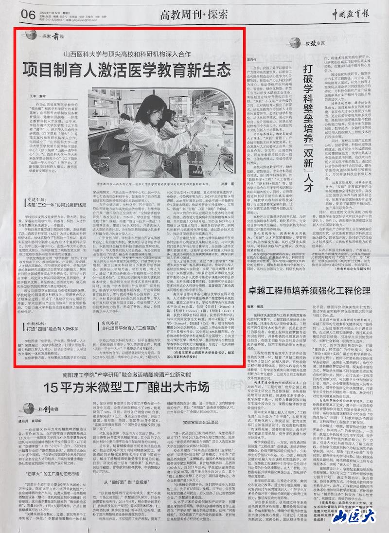 11月12日,《中国教育报》在第6版头条刊发了我校党委书记王军、校长解军的署名文章《项目制育人激活医学教育新生态》。