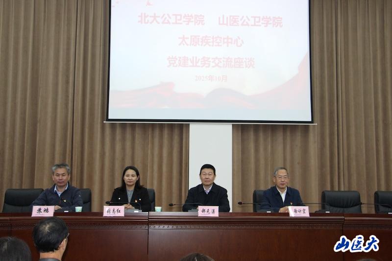 10月10日,高水平公共卫生学院党建共同体成员单位北京大学公共卫生学院、我校公共卫生学院与太原市疾病预防控制中心开展党建业务交流座谈会。北京大学公共卫生学院党委书记郝元涛、党委副书记苏鸿,太原市疾病预防控制中心党委书记、主任徐计宏,党委副书记钱月红,副主任郝瑞岗、张萍,我校公共卫生学院党委书记张志红、副院长邱服斌、党委副书记蔚钰琼、副院长宋欢等出席会议。来自各方的党员代表共70余人参加了会议。