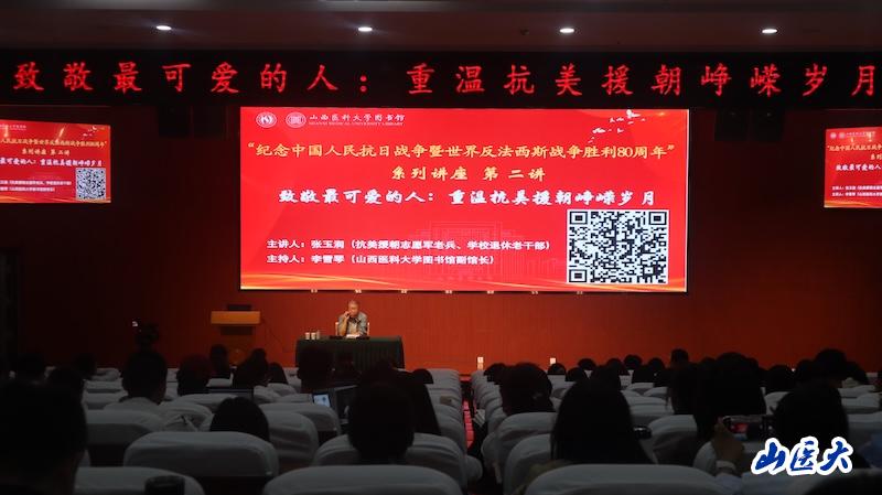 讲座中,张玉润老师以战争亲历者的视角为锚点,结合真实历史脉络,深情讲述了中国人民志愿军在极端艰苦条件下保家卫国、浴血奋战的壮阔史诗,深刻诠释了战争背后凝聚的家国情怀与英雄气概。张玉润老师强调,重温这段镌刻着牺牲与荣光的历史,不仅是缅怀先烈,更是汲取一种忠诚报国、敢打必胜、众志成城的精神力量。李雪琴副馆长在总结中鼓励同学们要把老兵的故事、先辈的精神,转化为钻研医学知识、提升专业能力的动力,让英雄精神在新时代继续闪耀光芒。