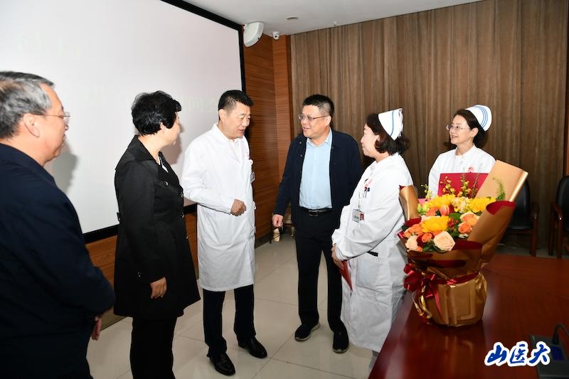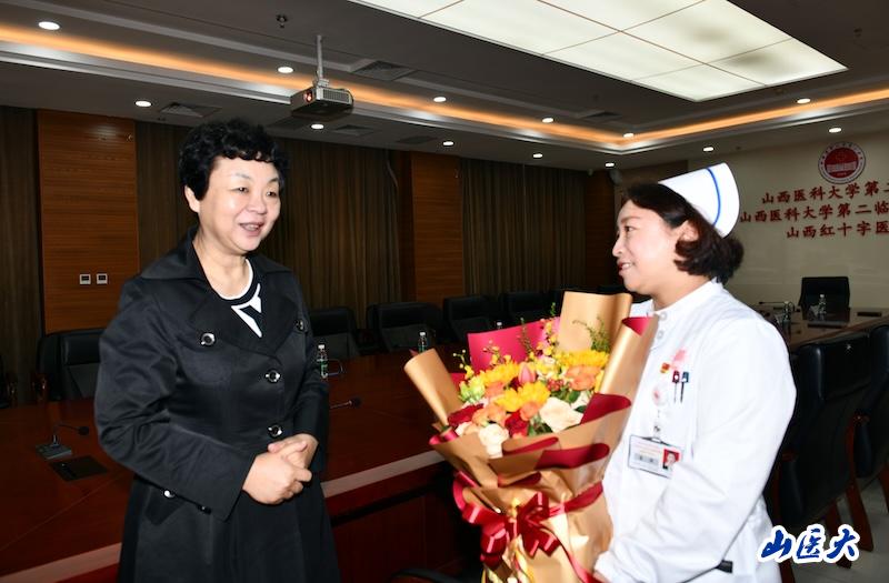 9月28日上午,山西省人社厅党组成员、副厅长李浓,省人社厅就业促进处处长尹延丰、副处长陈秀丽一行,来到我校附属第二医院慰问全国抗击新冠肺炎疫情先进个人、老年病科一病区副护士长姜萍并致以诚挚问候与崇高敬意。附属第二医院党委副书记、院长赵斌,副院长牛金亮以及医院相关部门负责人一同参加慰问。