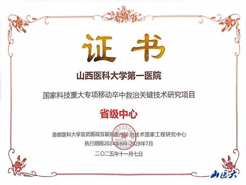 省级中心落户我校附属第一医院,是国家对第一医院在全省脑卒中防治领域引领地位的权威认证。作为山西省首批国家卫生健康委员会脑卒中防治工程基地医院、省内首家国家五星级高级卒中中心,第一医院长期承担着区域卒中救治的示范引领职责,同时身兼山西省脑血管病防治技术牵头单位、山西省卒中学会会长单位、山西医科大学脑血管病研究中心等多重使命;以神经内科、神经外科、急诊医学中心三大国家临床重点专科为核心,整合多学科优势资源组建脑血管病中心,汇聚多名行业顶尖专家组建医疗团队,在脑梗死超早期溶栓、机械取栓、出血性卒中治疗等关键技术领域持续领跑全省。