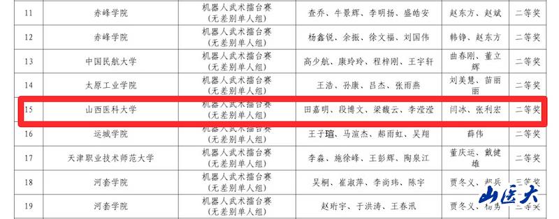 11月15日,华北五省(市、自治区)大学生机器人大赛决赛在北京信息科技大学落下帷幕。由我校2024级智能医学工程专业田嘉明、梁馥云,临床医学专业段博文,眼视光学专业李滢滢4位同学组成“梦舟队”,以优异战绩喜获二等奖,在山西省参加本次大赛的高校中位列第二名,延续了我校去年在该赛事中的辉煌。