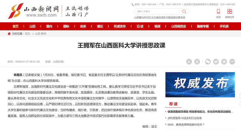 山西新闻网 | 王拥军在山西医科大学讲授思政课
