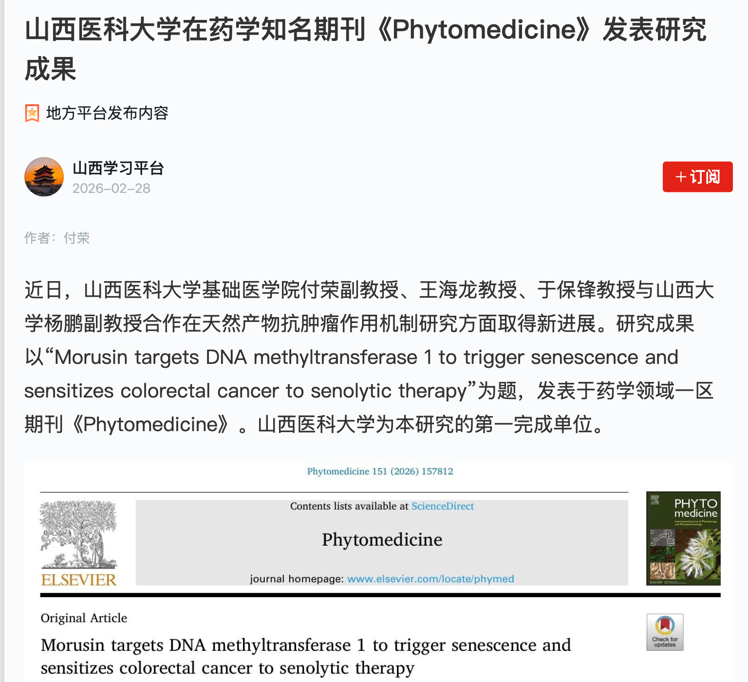学习强国 | 山西医科大学在药学知名期刊《Phytomedicine》发表研究成果