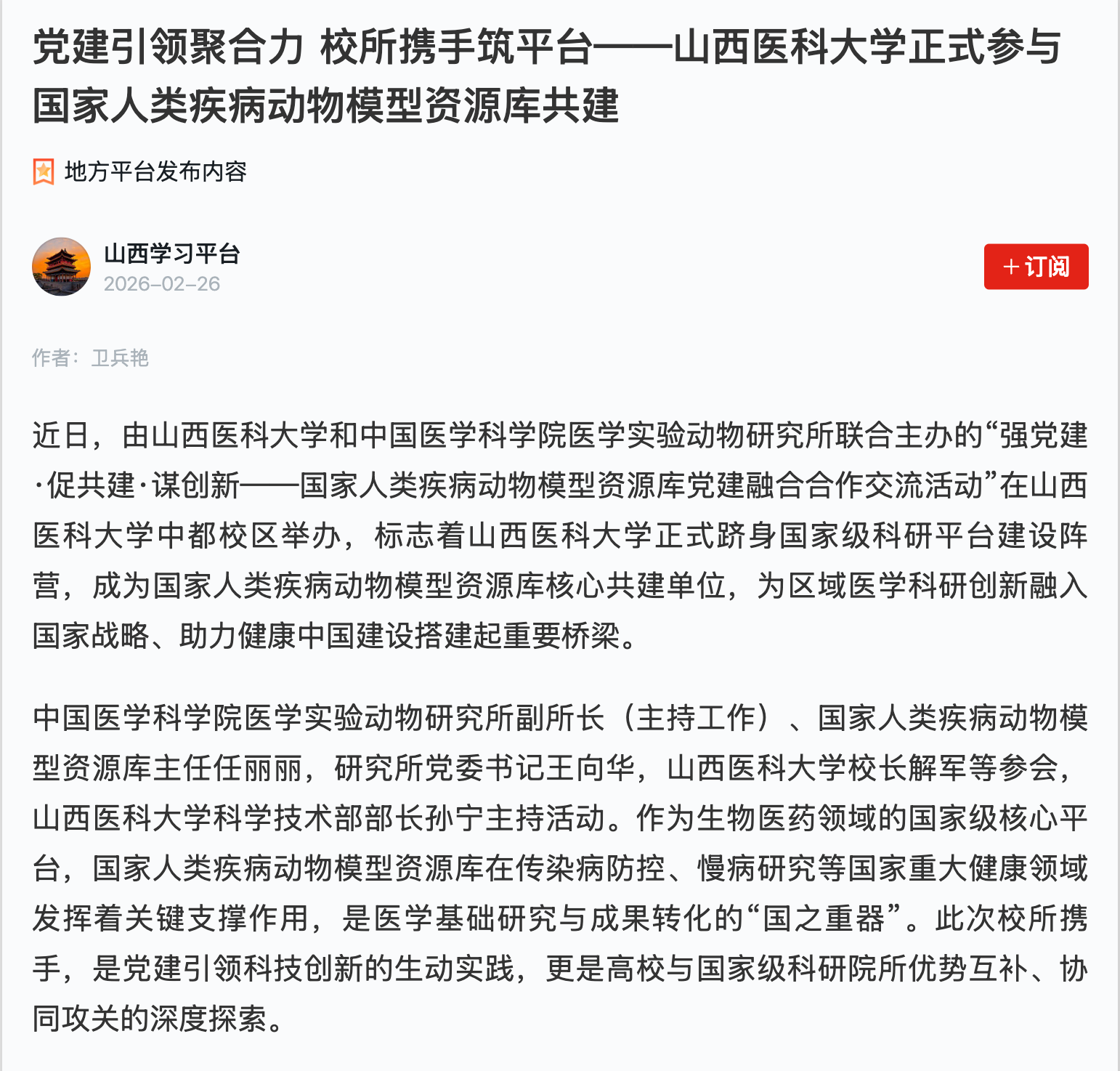 学习强国 | 党建引领聚合力 校所携手筑平台——山西医科大学正式参与国家人类疾病动物模型资源库共建