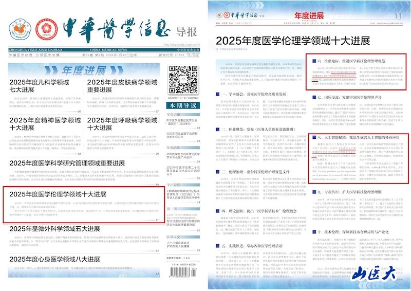 1月12日,《中华医学信息导报》公布了《2025年度医学伦理学领域十大进展》,我校三项研究成果入选,展现了我校在医学伦理学领域的丰厚积累与重要贡献。