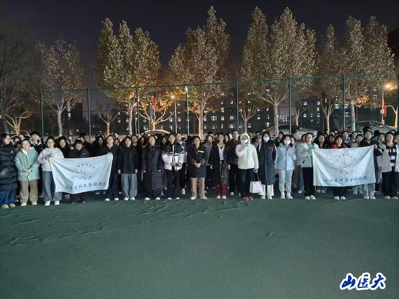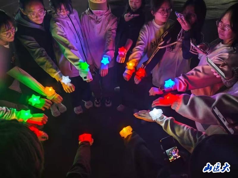 夜幕降临,华灯初上,风雨操场被点点荧光点亮。参与师生手持创意星星灯,佩戴荧光手环、荧光棒,五彩斑斓的灯光在夜色中交织闪烁,现场气氛热烈欢快,青春洋溢。活动开始前,全体参与者共同录制加油助威视频,并拍摄荧光主题大合照,定格下属于山医学子的活力瞬间。