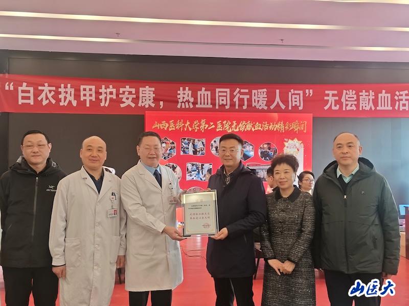 血液是生命的源泉,是无法人工合成的宝贵医疗资源。每一袋血液,都可能为一个垂危的患者点亮生命的希望。我校附属第二医院积极响应保障临床用血的号召,大力弘扬无私奉献的人道主义精神,由医务部与输血科联合发起无偿献血倡议,呼吁全院适龄健康职工踊跃加入献血者行列,用实际行动诠释“医者仁心”的深刻内涵。活动现场,一早就有职工赶来,在献血登记处进行登记。献血人群中,有揣着听诊器的医生,也有刚下夜班的护士,现场没有豪言壮语,只有仪器轻柔的嗡鸣,鲜红的血液顺着透明导管流淌,仿佛生命最原初的脉搏。活动现场,董红霖副院长代表我校附属第二医院接受了太原市血液中心领导授予的写有“无偿献血凝大爱,奉献爱心显文明”的感谢证书。